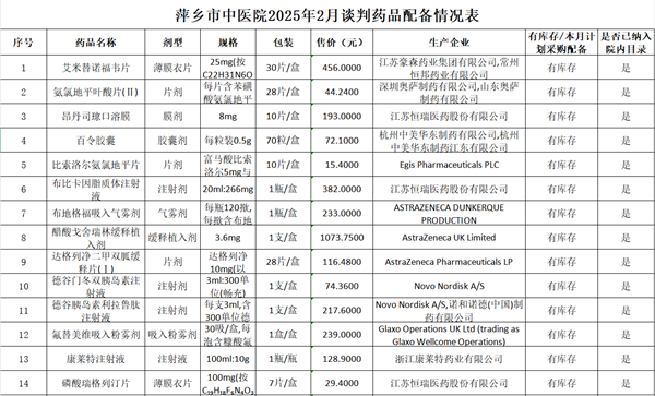 萍乡市中医院配备谈判药品情况(2025年2月)
