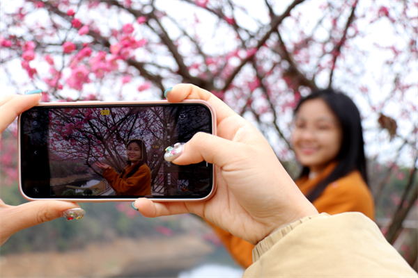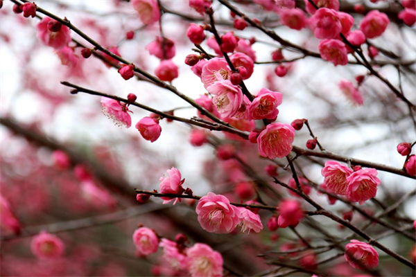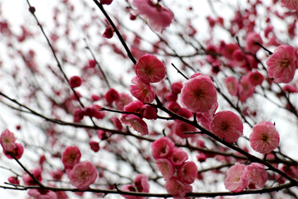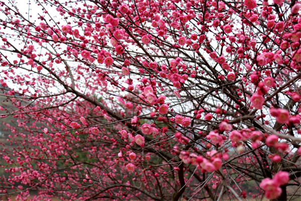 走进园内,映入眼帘的是一片片粉红色的梅花,花瓣娇嫩,白色的花蕊点缀其间,在天空的映衬下显得格外娇艳,吸引众多游客前来观赏打卡。