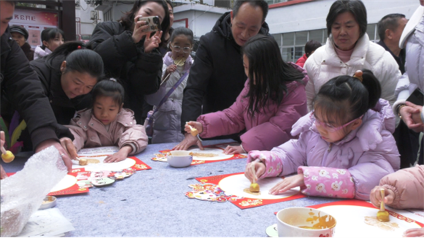 活动现场,猜灯谜、制糖画、拓福字等传统民俗活动精彩纷呈。糖画摊位前,色彩鲜艳的卡通人物模型吸引了众多居民的目光,大家排起长队等待。孩子们手捧着精美的糖画,笑得合不拢嘴。另一边,猜灯谜活动同样热闹,居民们三五成群,围在一起讨论谜底,猜中者满心欢喜地兑换奖品。此外,拓福字环节也吸引了不少居民,大家亲手拓印福字,寄托对新年的美好祝愿。
