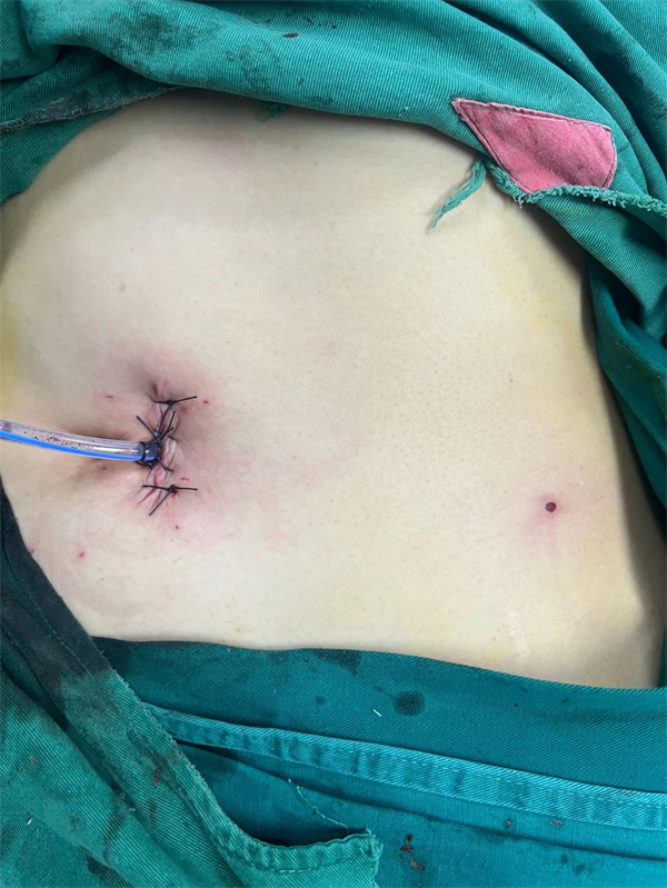 脐部切口与皮肤天然褶皱重合,左侧腹针尖大小切口