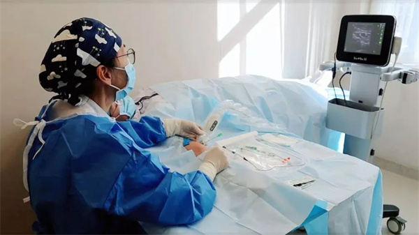北京协和医院临床营养科护士长孙文彦正在为患者进行经外周静脉穿刺中心静脉导管(PICC)置管。