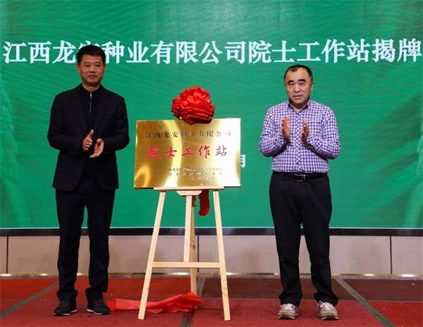 ▲江西省超级水稻研究发展中心研究员蔡耀辉、江西龙安种业有限公司董事长谭勇共同为江西龙安种业有限公司院士工作站揭牌