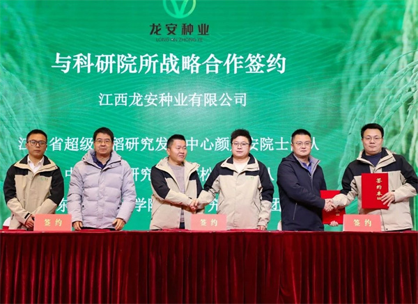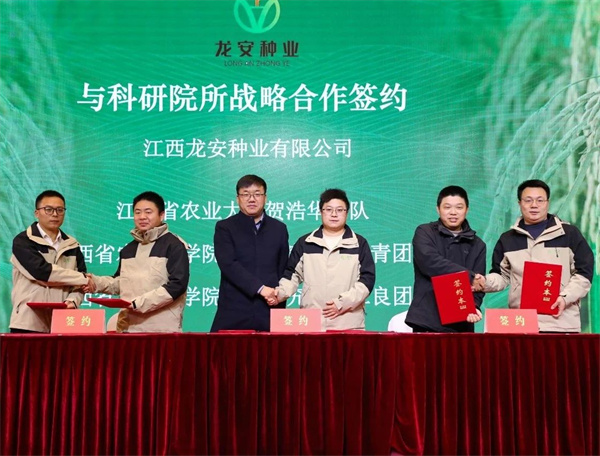 ▲江西龙安种业有限公司与各科研院所分别进行战略合作签约。(江西省超级水稻中心颜龙安院士团队、中国水稻研究所胡培松院士团队、广东省农业科学院水稻研究所王丰团队、江西农业大学大贺浩华团队、江西省农业科学院水稻研究所肖叶青团队、江西省农业科学院水稻研究所黄仁良团队)