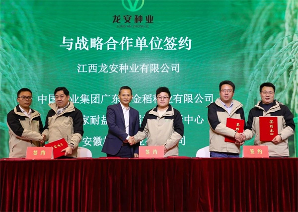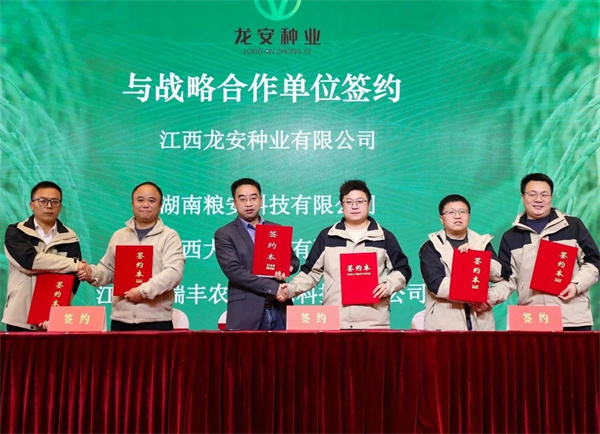 ▲江西龙安种业有限公司分别与各企业进行合作签约(中国种业集团广东省金稻种业有限公司、国家耐盐碱水稻技术创新中心、安徽枝柳农业有限公司、湖南粮安科技有限公司、江西大众种业有限公司、江西普瑞丰农业生态科技有限公司)