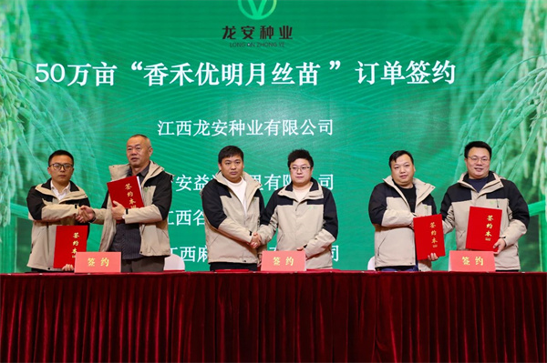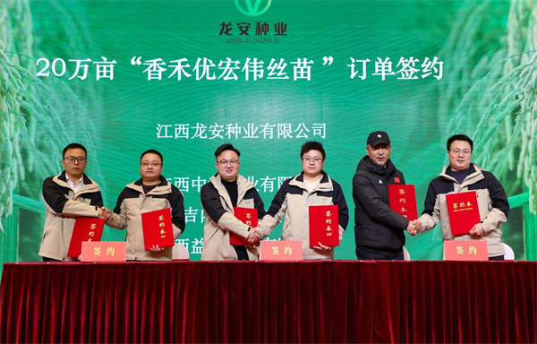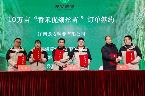 ▲江西龙安种业有限公司分别与各公司进行订单签约( 2025 年 50 万亩 “香禾优明月丝苗”、20 万亩 “香禾优宏伟丝苗”、10 万亩 “香禾优细丝苗”)