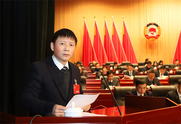 ▲黄彩国代表政协湘东区第九届委员会常务委员会向大会报告工作
