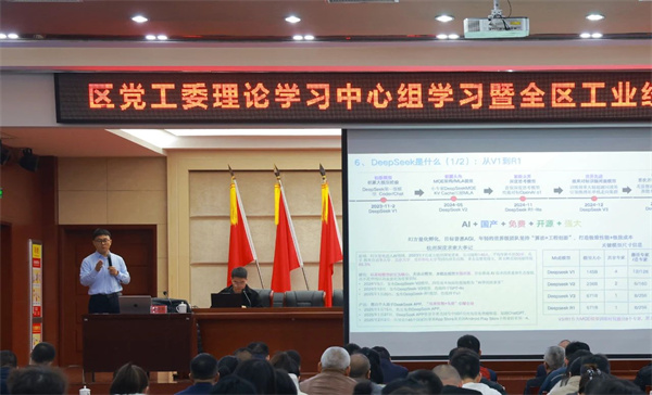 3月3日,经开区召开党工委理论学习中心组学习暨工业经济高质量发展大讲堂,专题学习deepseek和豆包等AI工具的使用。会议邀请中国移动上海产业研究院高级技术专家、副院长,中国移动十百千专家黄士刚作主题授课。市委常委、区党工委书记杨博主持并讲话。他强调,全区上下要学以致用,将理论知识与实践相结合,把人工智能作为培育发展新质生产力的重中之重,为推动全区工业经济高质量发展贡献更多力量。中国移动萍乡分公司党委书记、总经理黄闽,区党政领导班子、区属各单位各部门负责人、相关企业负责人参加学习。