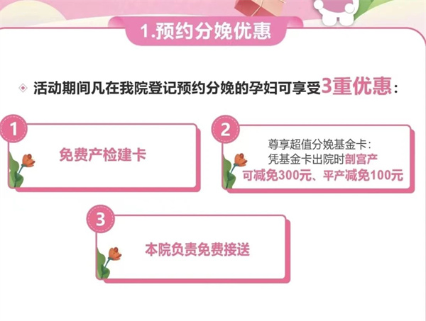2、尊享超值分娩卡:凭分娩卡出院时剖宫产可减免300元、平产减免100元;