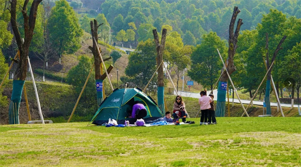 桃花缀满枝头,玉兰擎起粉白花瓣,几株檫木花暗香浮动。春寒料峭尚未散尽,但公园的草坪、山道上早已热闹起来——草坪上孩童嬉戏追逐,山坡间游客登高望远,林荫下野餐垫铺展如画,一幅人与自然和谐共生的春日图景在占地约570余亩的公园内徐徐展开。