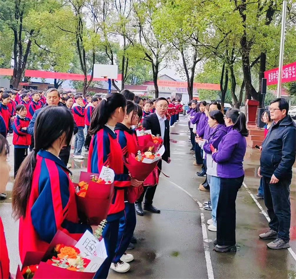 活动当天,学生们齐聚操场,手捧鲜花,眼神中满是期待与敬意。一场温馨的 “鲜花献教师” 活动在操场悄然拉开帷幕。当女老师们步入操场,学生们纷纷迎上前去,献上手中芬芳的花束,送上真挚的祝福,向所有女教师表达最崇高的敬意。