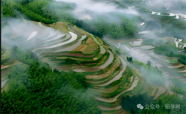 待得酉牌时分,太阳落山,月光升空,孽龙闻钟鼓之声便驱云使雷,狂风顿起,地动山摇,土木自动,孽龙手抓一下一坵田,足顿一下一坵田,尾扫一下一坵田,初时,钟鼓之声平稳,造田斟酌,故田大;而后,尼姑闻得庵外声响甚是胆怯,撞钟擂鼓愈急,孽龙造田亦急,故田小……。直至东方渐露鱼肚白,钟鼓声止,庵外万籁俱寂,三尼姑方敢掩开庵门,只见:从山顶至山腰,从山腰至山脚,密密麻麻布满梯田,或方或圆、或宽或窄、或长或短、或大或小,错落有致,层层叠叠镶嵌在山坡。岸矮坵大之田在上千坵,岸高坵小之田在下千坵,上下千坵共两千余坵。有诗赞云: