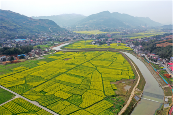 荆坪村泉背湾,游步道蜿蜒穿梭于金色的油菜花海。微风拂过,油菜花如层层波浪起伏翻涌,每一步都像是踏在阳光编织的金色地毯上。沿着河边游步道徐行,一边是繁花似锦,一边是潺潺流水。累了,就在凉亭下小坐,与亲友谈天说地,或是对弈一局,让春日的时光在欢声笑语中缓缓流淌。