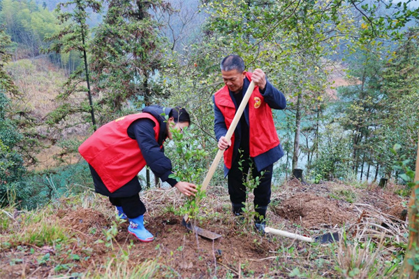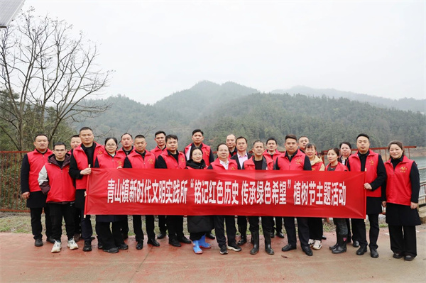 在全国第47个植树节来临之际,青山镇源头村的石峡冲水库畔呈现一片“红绿交融”的繁忙景象。一场以“铭记红色历史 传播绿色希望”为主题的植树公益活动在此举行。