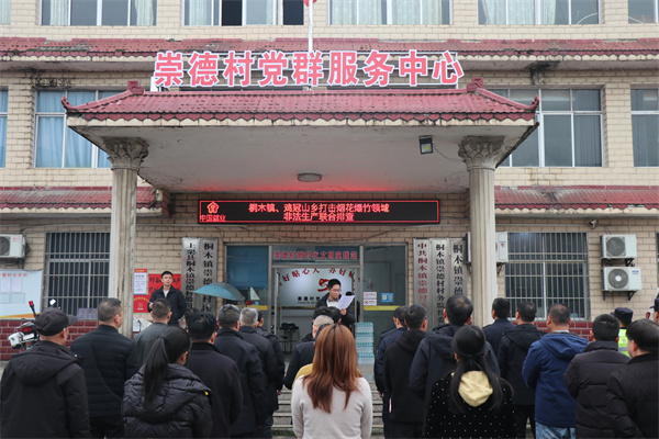 为进一步加强我镇烟花爆竹安全管理工作,严厉打击烟花爆竹领域非法、违法行为,有效防范烟花爆竹安全事故发生,3月12日上午,来自桐木镇、鸡冠山乡班子成员、派出所民警、花炮打非治违岗工作人员、驻村工作组以及边界四村村“两委”干部共70余人,集合在崇德村村委会,开展烟花爆竹领域“打非治违”联合专项行动。