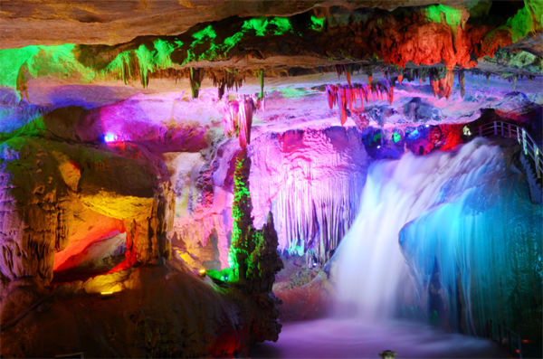 孽龙洞形成于1.8亿年前,长4.2公里,蜿蜒曲折,地下河贯穿首尾,洞内曲径通幽,瑰丽奇胜,属典型的喀斯特地貌,冬暖夏凉,常年恒温18℃左右,较大的洞厅高达30米,可容纳近千人,洞中飞瀑流泉,各种钟乳奇观,被誉为“地下艺术长廊”。