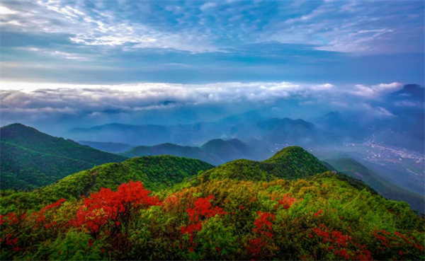 杨岐山映山红,花开时漫山遍野,初开如繁星点点,盛开似春日彩霞,除红色外,还有紫、粉、白等色花朵杂糅其间,将山脉染成一幅色彩斑斓的秀美画卷。