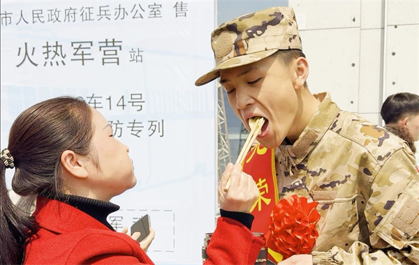 入伍新兵周成煜的母亲杨女士准备了饺子,特意在临别时喂儿子吃上几口,一边叮嘱:“到了部队不要怕吃苦,要勇往直前,我们全家人都为你感到骄傲!”