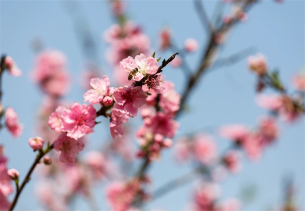 “桃花浅深处,似匀深浅妆”,每一朵桃花都像是精心妆扮过的仙子,在枝头浅笑。它们有的花瓣完全展开,露出嫩黄的花蕊;有的则含苞待放,羞涩地打着朵儿。桃花的美,带着几分甜蜜与浪漫,是春天里最温柔的一抹色彩,撩拨着人们的心弦。