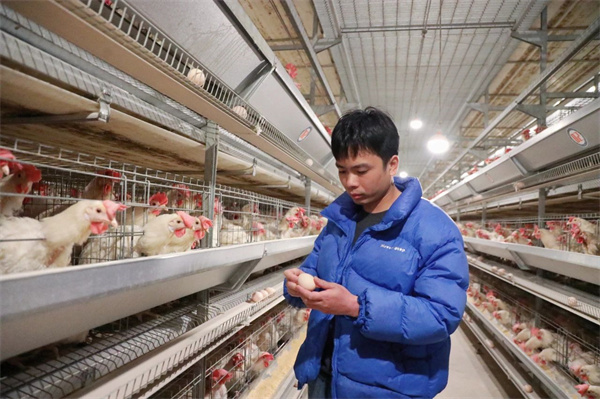 清晨的温盘村薄雾未散,青山环抱的现代化鸡舍内,传送带“嗡嗡”运转,一枚枚新鲜鸡蛋顺着轨道滑入分拣筐。“90后”青年石亚东俯身调试设备参数,身后的立体鸡笼整齐排列,蛋鸡在恒温环境中悠闲啄食。“饲料投喂、温度控制、鸡蛋收集全是自动化,和前几年的手工作坊相比,简直是两个世界。”他笑着说道。