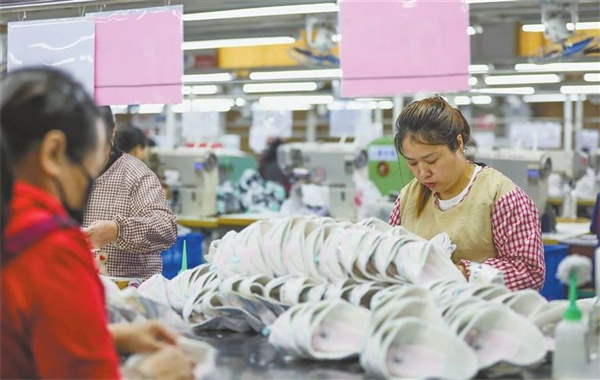 萍乡市湘东区引进劳动密集型、手工加工型企业,让当地群众和返乡农民实现家门口就业。图为4月8日,麻山镇的一家鞋业生产车间,工人在赶制产品订单。