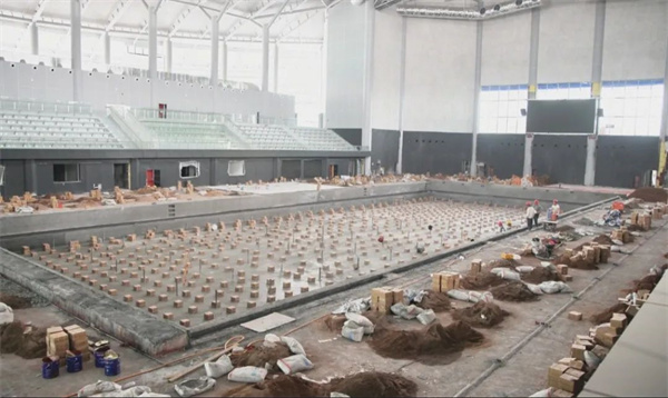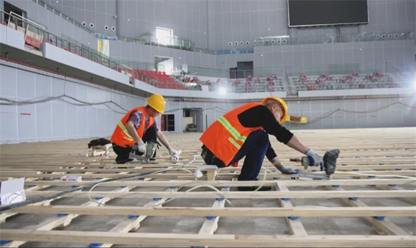 在体育馆,工人们正在进行木地板的龙骨铺架。地面将采用专业的木地板,具备良好的弹性和防滑性,能够满足排球、篮球等多种赛事的需求。