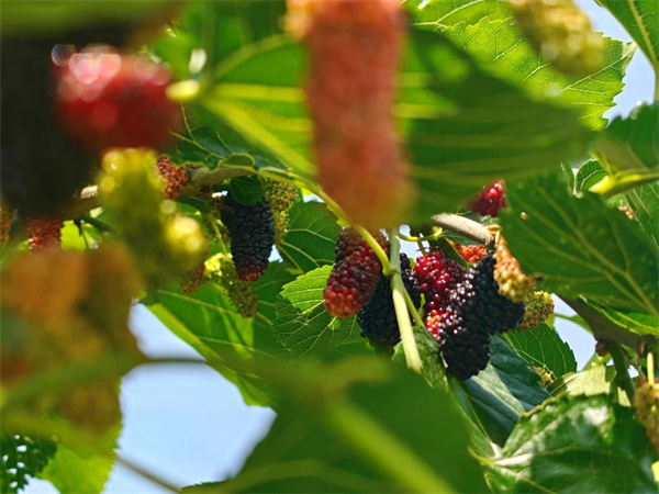 打卡出片:阳光透过桑叶洒在果篮上,紫黑桑葚衬着绿叶,随手一拍都是美照!别忘了找找藏在枝头的“心形桑葚”,和它合个影,幸运一整年~