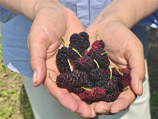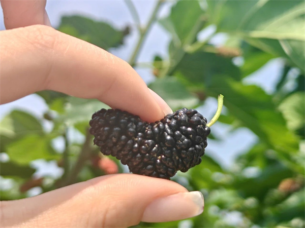 品种控狂喜:园子里藏了“无籽大十”和“奶油桑葚”两大王牌。无籽大十像紫水晶串成的项链,颗颗饱满多汁,轻轻一捏就爆浆,酸甜在舌尖炸开。奶油桑葚自带“贵族气质”,奶白中透着淡紫,口感清甜不腻,仿佛咬了一口春天的温柔。新鲜桑葚一口一个,爆汁的酸甜在嘴里蹦跶,比喝果汁还过瘾!