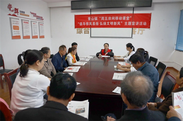 近年来,走进青山镇街巷村落、田间地头、广场集市,形式多样的文明实践理论宣讲随处可见,“周五田间移动课堂”宣讲品牌,凭借鲜活生动的语言、立体的宣讲解读、丰富的宣讲形式,让理论大餐“飞入寻常百姓家”。下一步,青山镇将持续擦亮“周五田间移动课堂”宣讲品牌,继续以“小切口”讲述“新理论”,用“身边事”感召“身边人”,推动宣讲内容真正入耳、入脑、入心。