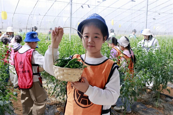 “原来辣椒叶子摸起来毛茸茸的,像小绒毯!”参与研学的刘向蕙蹲在辣椒植株旁,指尖轻触叶片,眼里满是新奇。活动现场,孩子们化身“小农夫”,提着竹篮穿梭在辣椒田间,挑选成熟的辣椒摘下。在工作人员的指导下,孩子们把采摘来的辣椒洗净,随后开始制作简单的辣菜。辣椒与热油碰撞发出的滋滋声响与孩子们的交谈声交织在一起,不一会儿,翠绿的辣椒配上蒜末、香油,清爽又带着微辣的香气便飘散开来。