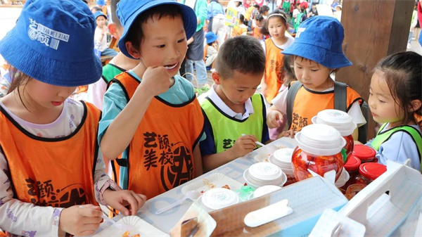 仙凤三宝园牧场人家里,辣酱非遗传承人廖维指着案台上的辣酱炒锅,向孩子们介绍起传统辣酱的非遗制作工艺。“火要调小,慢慢熬出香味!”廖维一边示范,一边指导孩子们用木勺匀速搅动。没一会儿,鲜红的辣椒渐渐变得浓稠油亮,一锅辣酱就做好了,孩子们趁热将辣酱装入一个个小瓶里,脸上满是成就感。李涵颖同学捧着自己亲手制作的辣酱说道:“自己动手做辣酱太有意思了!我要把自己做的辣酱带回家,让爸爸妈妈尝尝!”