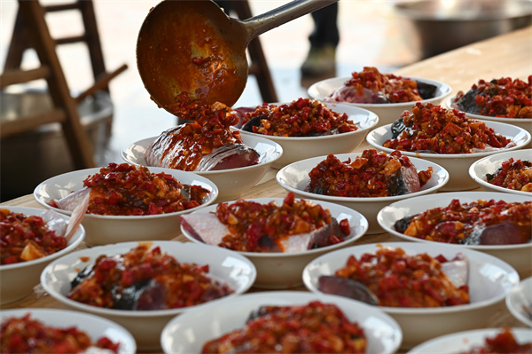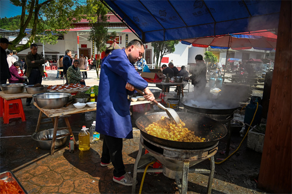 戏唱得热闹,乡厨们更是忙得热火朝天。掌勺师傅的铁勺在铁锅里翻飞,帮厨的妇人们手脚麻利,准备着“插田饭”。有全家福:肉丸、煮鸡蛋、肉片等食材,象征生活富足美满。土养广寒黑山羊:选用黑山羊细嫩之处,用盐、八角等调料烹制,寓意四季平安、三阳开泰。扣糯:糯米饭浇上土蜂蜜,再点缀枣蜜饯、花生粒,香甜软糯。爆炒深海墨鱼:将深海墨鱼与本地猪、鸡肉切丝,加入爽脆笋丝爆炒,海陆风味交融。五花扣肉:五花肉切成等量大小,颤巍巍地堆成小山,筷子一戳就陷进去,肥肉化在舌尖上,竟不觉得腻。本地土鸡:小火慢炖,保留鸡汤原汁原味。红椒牛肉:口感独特,辣而不燥、香而不腻。广寒菇烹肚片:烹饪精细,口感鲜美,寓意吉祥满堂。香薰肥肠搭配笋尖:肥肠薰谷壳香、笋尖鲜嫩,爽脆与醇厚交织,寓意长长久久。年年有鱼:选用新鲜捕捞的山塘草鱼,撒上剁椒、豆豉,大火蒸熟,鲜嫩香辣。这些菜品不仅地道新鲜味道丰富,还蕴含着深厚的本土文化和美好的祝福。十大碗排开,便是乡里人最朴素的体面了。酒是本地酿的谷烧,烈得很。
