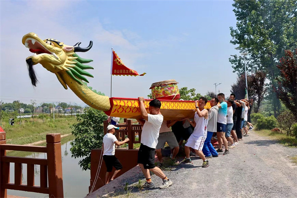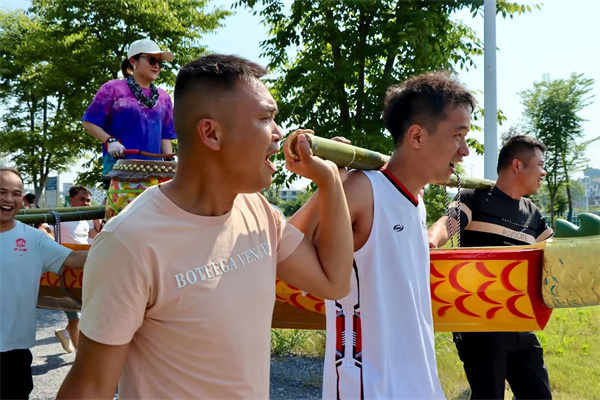 当日上午,龙舟队员抬着龙舟从赤山镇新时代文明实践所一直步行到龙舟下水的萍水河长沙口段,他们满怀期待,兴奋地讨论着即将下水的龙舟,言语间充满了对这一传统赛事的热爱与自豪。在一片热烈的欢呼声中,龙舟队员们精神抖擞地抬着龙舟,迈着整齐有力的步伐走向河边。他们的脸上洋溢着自信与坚定,展现出对即将到来的龙舟赛的满满斗志。