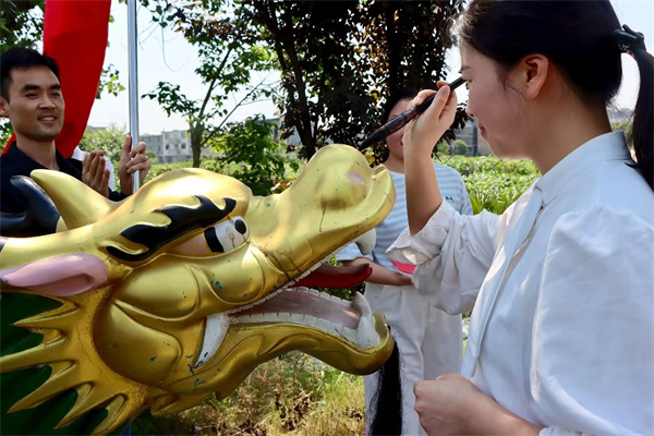 现场鞭炮齐鸣,锣鼓喧天,上午10时18分,镇党委副书记、镇长秦美红为龙舟点睛。龙舟在震天欢呼中破浪入水,现场气氛被推向高潮,预示着新一轮的龙舟竞渡即将拉开帷幕。