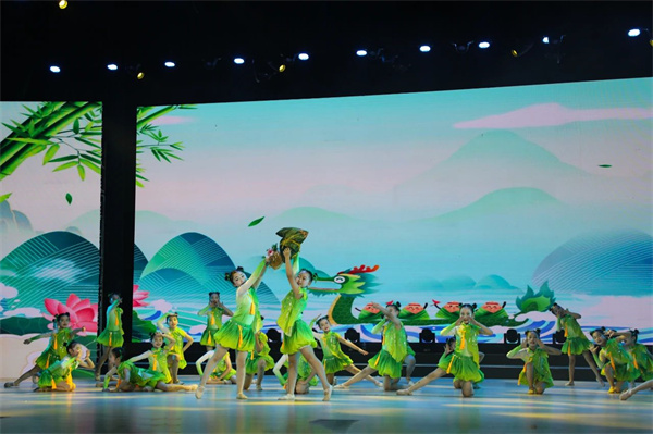 随后,舞台上呈现出一幅幅生动的画面。孩童们身着彩色服饰,手持翠绿的粽叶,轻盈起舞,动作流畅而富有韵律。舞蹈《粽享安康》串联起端午节的传统习俗与文化内涵,让观众在欣赏美轮美奂的舞蹈的同时,也深刻感受到了端午节的独特魅力与浓厚氛围。