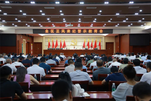 6月5日,经开区正风肃纪警示教育大会召开。市委常委、区党工委书记杨博主持并讲话。他强调,全区各级党组织和党员干部要深入学习贯彻习近平总书记关于加强党的作风建设的重要论述和中央八项规定及其实施细则精神,进一步筑牢思想防线、坚守法纪红线、守住廉洁底线,切实把学习教育成果转化为高质量发展的实效。