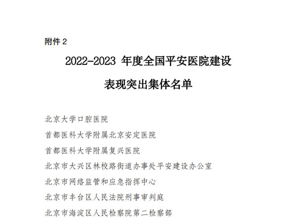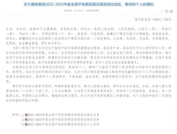 近日,国家卫生健康委等部门联合发布表彰通报,根据国家卫生健康委《关于通报表扬2022-2023年度全国平安医院建设表现突出地区、集体和个人的通知》(国卫医急函〔2025〕130号),萍乡市中医院被授予“2022-2023年度全国平安医院建设表现突出集体”荣誉称号。