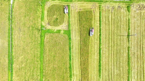 农机手驾驶着收割机在农田里来回穿梭,伴随着机器的轰鸣声,一茬茬稻穗不断地被卷入收割机,切割、脱粒等工序一气呵成。稻谷顺着管道倾泻而下,源源不断地涌向运输车。机械化的高效作业,让田间呈现出一派紧张而有序的忙碌、丰收景象。