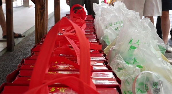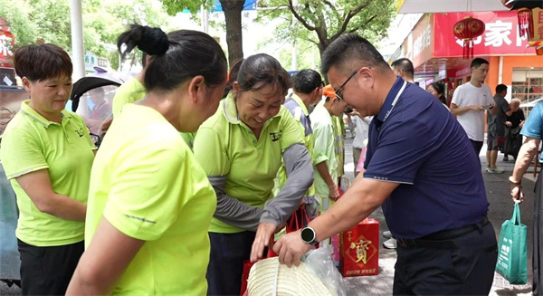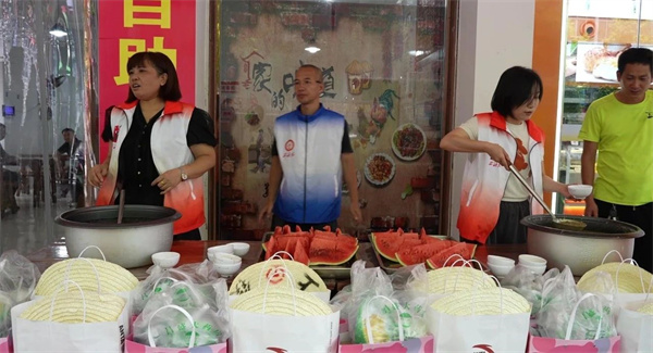 上午10点,在“小哥食堂”门前空地,活动现场已热闹起来。工作人员和志愿者们早早支起遮阳棚,物资桌被收拾得整整齐齐:冰镇绿豆稀装在保温桶里,揭开盖子便有凉意扑面而来;切好的西瓜块红瓤多汁,在冰水里镇得透心凉;独立包装的防晒袖套、藿香正气水、清凉油等防暑物资码放得整整齐齐,组成了一份份沉甸甸的“夏日清凉礼包”。