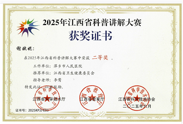 近日,2025年江西省科普讲解大赛圆满结束。经过激烈的角逐和专家的严格评审,萍乡市人民医院选派的参赛代表凭借优秀表现,在全省各行业众多选手中脱颖而出,荣获总决赛二等奖。