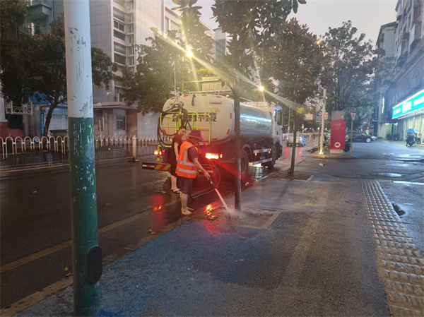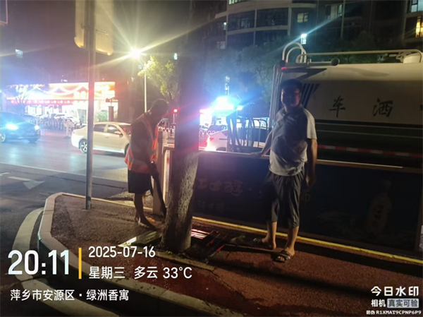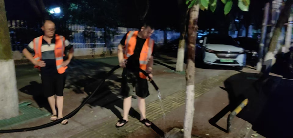 近日,持续高温天气给城市绿化带来严峻“烤”验。为守护辖区路段行道树的生机,市园林管理中心迅速行动,积极开展抗旱护绿工作,通过加强洒水频次,采取“白加黑”三班倒不间断洒水的方式,为行道树送去“及时雨”。