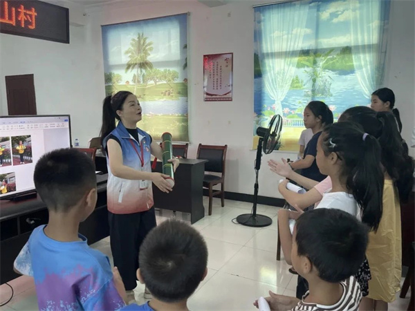 “咚咚锵,咚咚锵......”明山村新时代文明实践站里,文化导师、萍乡渔鼓非遗传承人吴向丽正带着孩子们体验这项传统艺术。她手中的渔鼓时而轻快、时而舒缓,孩子们围坐一圈,目不转睛地盯着看。