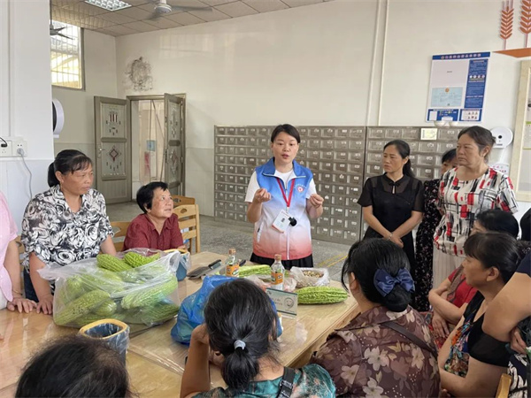 在福田镇新时代文明实践所,文化导师、上栗山枣糕传统制作技艺传承人梁红为30余名村民现场教授盐果子甘草苦瓜制作技艺。“苦瓜要选嫩一些的,切片后要用盐腌制......”她详细讲解食材选择、处理方法及制作技巧,并示范操作流程。学员们在她手把手的指导下动手实践,体验非遗美食的独特魅力。梁红的传授不仅让传统技艺得以延续,也为乡村文化增添了烟火气息。