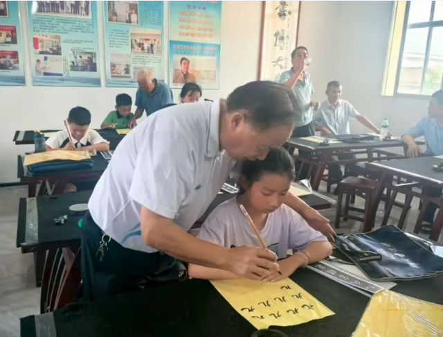 初秋的午后气温仍然滚烫,大义乡村书法苑里,却飘着淡淡的墨香与清凉。68岁的退休党员教师胡建萍正站在一名小女孩身后,指导她左手按着铺开的宣纸边,右手握着一支狼毫笔运笔:“捺画要像人伸腿,得有筋有骨。”汗水顺着他鬓角的银丝渗出。讲台上的废纸堆上,密密麻麻写满了各式各样的字,都是给来上课的书法爱好者练手的。