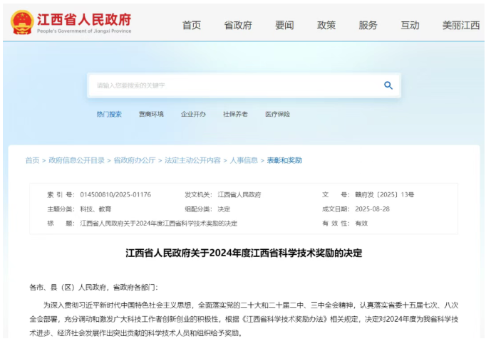 江西省人民政府关于2024年度江西省科学技术奖励的决定