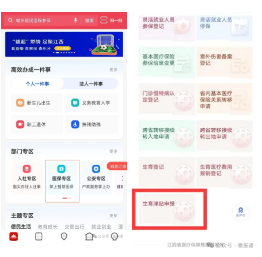 2.打开“赣服通”后,点击“医保专区”,下拉点击“生育津贴申报”。