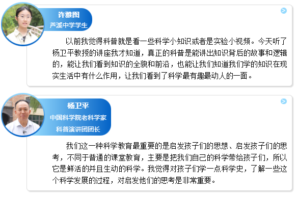 我们这一种科学教育最重要的是启发孩子们的思想、启发孩子们的思考,不同于普通的课堂教育,主要是把我们自己的科学带给孩子们,所以它是鲜活的并且生动的科学。我觉得对孩子们学一点科学史,了解一些这个科学发展的过程,对启发他们的思考是非常重要。