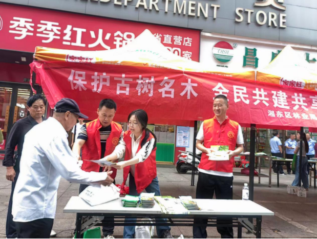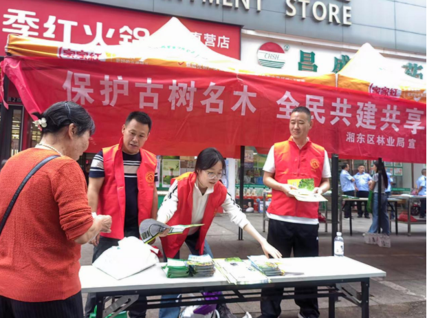 活动现场,工作人员通过悬挂横幅、发放古树名木科普宣传册和《古树名木保护条例》手册等方式,结合“政策解读+典型案例”的形式,详细解释非法采伐、移植、损害古树名木的法律责任,从而提高群众对古树名木的认知度和保护意识。